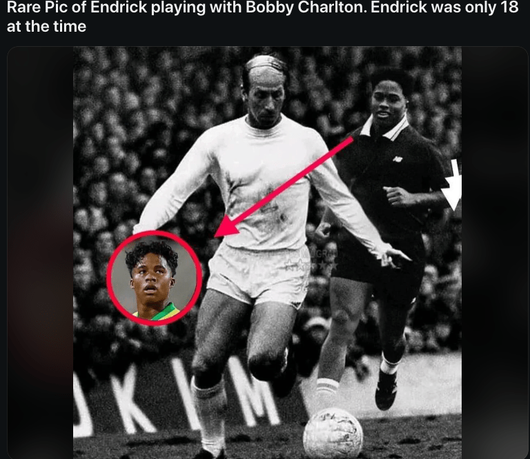 Another target? Real Madrid’s young galáctico Endrick, who recently joined the club. During his first press conference, when asked to name past players who inspired him, Endrick—an 18-year-old Brazilian with a long list of national football royalty to choose from—went with Bobby Charlton. It quickly became clear his staff had instructed him to mention Charlton in a bizarre attempt to make him seem knowledgeable about the history of the game. The backfire was biblical. The internet was flooded with memes of Endrick in various 1960s scenarios, watching Bobby play or hanging out with the Manchester United legend. There’s even “real” footage of them training together. If you Google Bobby Charlton now, the first person who appears under “people also search for” is Madrid’s number 16. What started among Brazilian fans quickly spread globally, overshadowing any content play Endrick was involved in for weeks.